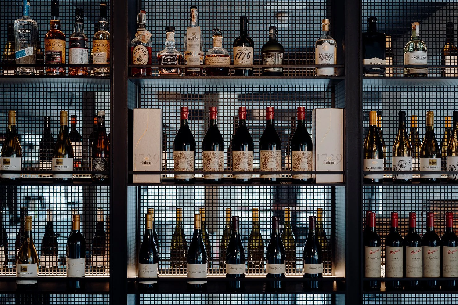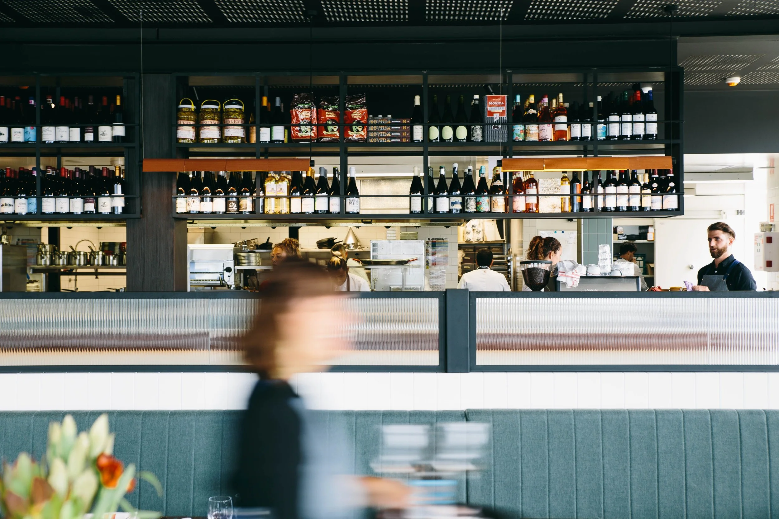 Upon entry to the space sits a large wine bottle display and waiter station, a bespoke joinery piece designed to provide division between the venue’s adjoining wine and gin bar while offering ample, practical storage for staff during service.